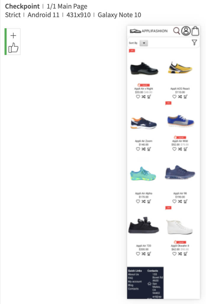 Another cool thing about these snapshots is that they capture the full page. For example, the main page will probably display only 2-3 rows of shoes within its viewport on a device. However, Applitools Eyes effectively scrolls down over the whole page and stitches together the full content as if it were one long image. That way, visual snapshots capture everything on the page – even what the user can’t immediately see!
