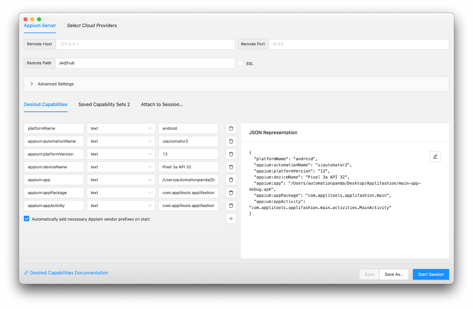 - I used the default remote host (127.0.0.1) and remote port (4723).
