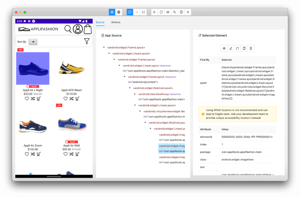 It was awesome to see the Applifashion app running through Android Studio. I played around with scrolling and tapping different shoes to open their product pages. However, I really wanted to do some automated testing. I chose to use Appium for automation because its API is very similar to Selenium WebDriver, with which I am very familiar.