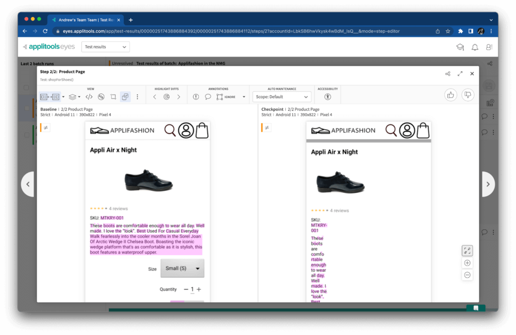 I wanted to try this change detection with NMG, so I reran tests against a slightly broken “dev” version of the Applifashion app. Can you spot the bug?