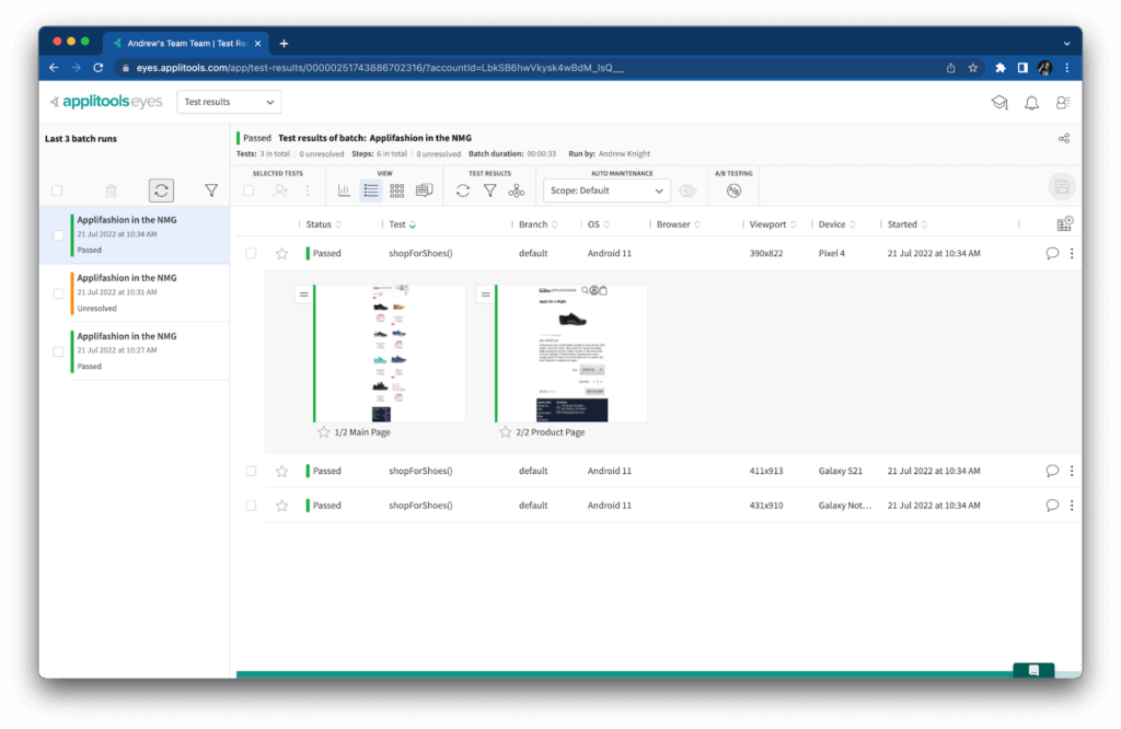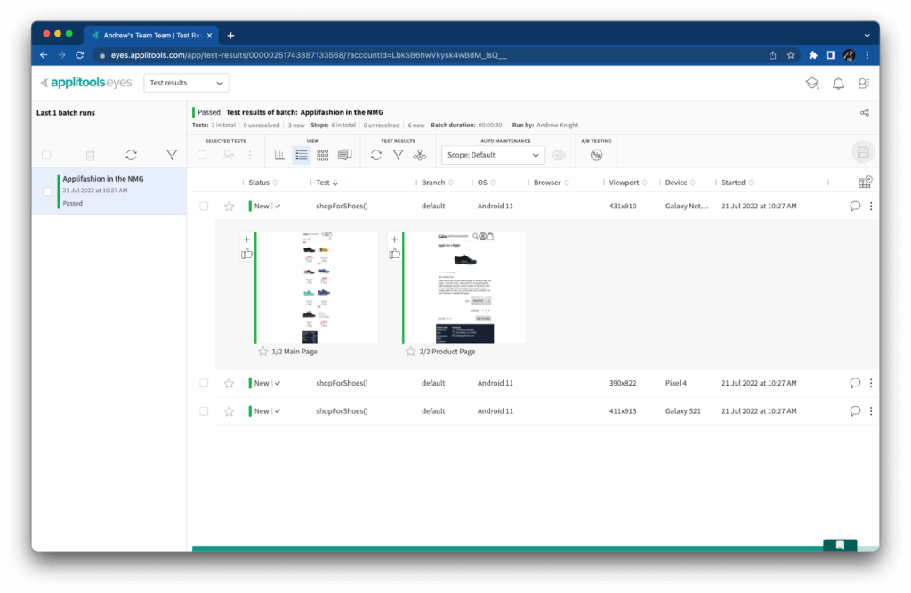 When I ran the test with these visual assertions, it ran one time locally, and then NMG ran each snapshot against the three target devices I specified. Here’s a look from the Applitools Eyes dashboard at some of the snapshots it captured:
