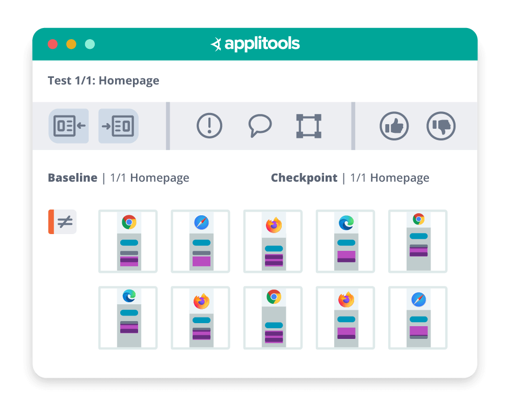 With the Ultrafast Grid, Applitools gives testing teams complete cross-browser testing coverage in dramatically less time. While tests run on the Execution Cloud, the Ultrafast Grid will rerender the UI across different browsers in just seconds, making sure that your application works and looks right on any screen or environment.