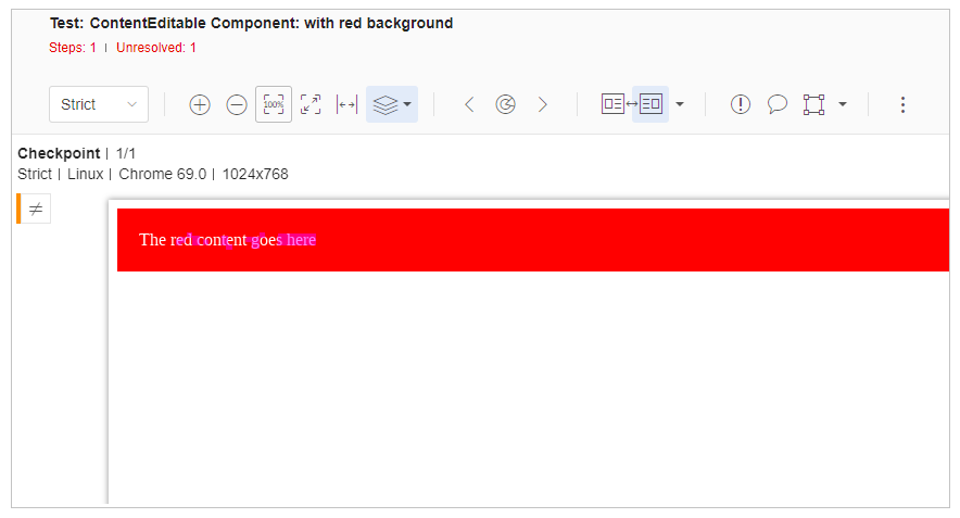 Running the second story fails, as expected because we changed the content that was initially displayed inside the ContentEditable component. The test result output provides you with a link to check the discrepancies online. Click on the link to open the issues directly in the Applitools Test Manager: