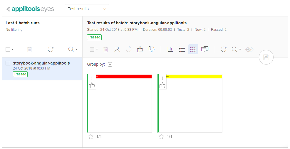 The test manager lists the test runs or batches (as referred to by Applitools) on the left- hand side. Clicking on any of the batches displays all of the snapshots for all of the Storybook stories in your application.