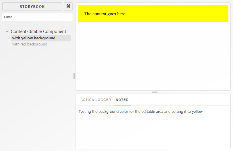 The first story renders the ContentEditable component with a yellow background. While the second renders the component with a red background.
