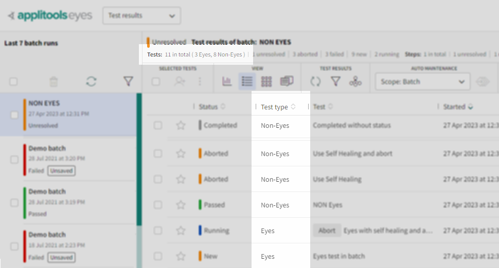If there are Non-Eyes test in a batch, the Test Manager displays the number of Eyes and Non-Eyes tests in the batch and there is an option to view a Test Type column which identifies which tests were Non-Eyes tests.