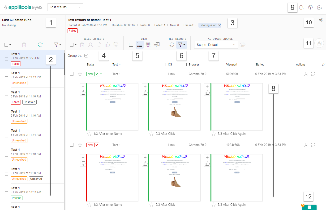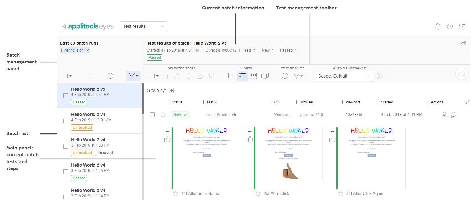 The Eyes Test Manager screen is divided into two main areas. In the left panel, Test Manager displays information about the batches that were run by your team and allows you to select the “current” batch to review. On the right, Test Manager displays the tests and steps of the batch you selected. More specifically: