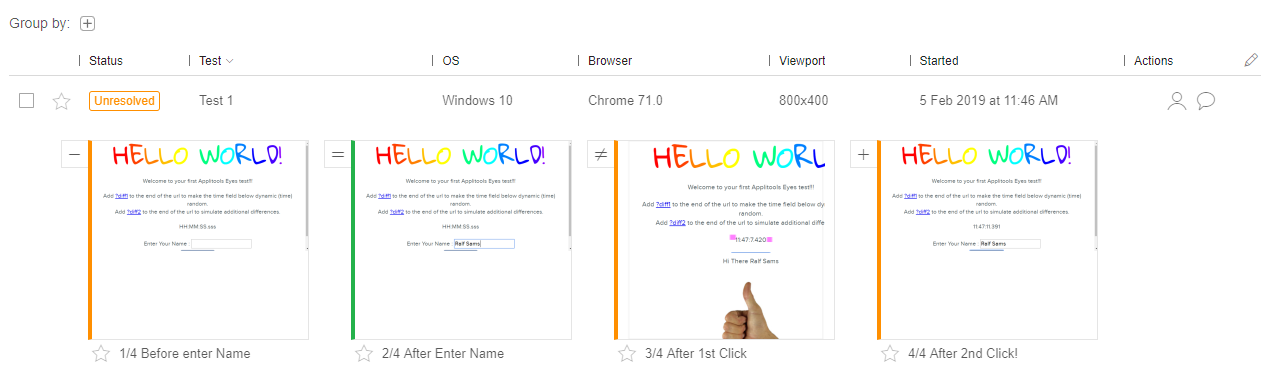 After the first test run, Eyes will have automatically created a baseline with all the checkpoint images captured during that first run. In subsequent test runs, Eyes compares the sequence of captured images to the sequence of images in the baseline, and there are four possible outcomes, as you can see in the following screenshot of a test result: