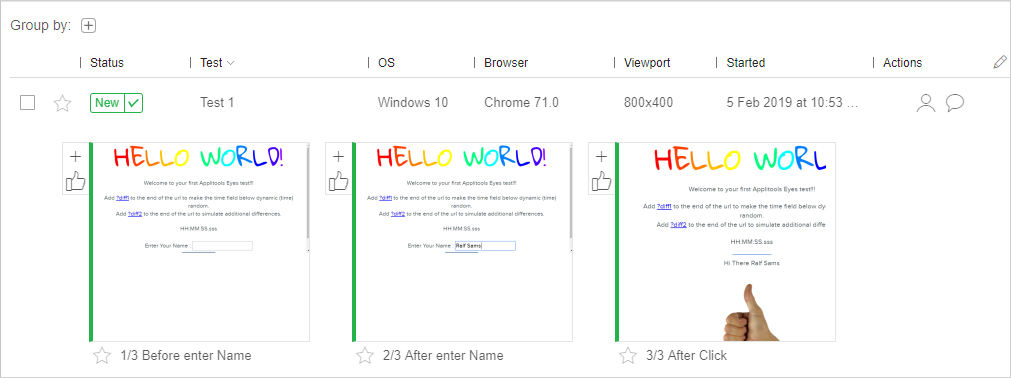 Remember that it is only in the case of a new test that Eyes displays the accept icon automatically, indicating that Eyes has automatically accepted the step.