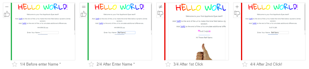 After you click the accept or reject buttons, icons appear on the step thumbnail that indicate that the action has been completed. The status of the test is indicated by the color of the bar on the left – green if the step passed and red if the test failed. Eyes logs which steps have been reviewed (accepted or rejected) and which haven't, and this determines whether or not the test is considered resolved and fully reviewed.