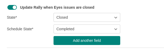 • You can enable a field that updates Rally when an issue is closed in Eyes.