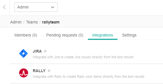 1. Load the Admin page using the page selector. Select the Teams panel and click the row containing the team you want to configure. On the team configuration page, click on the Integrations tab and then click on the Rally integration section to expand it.