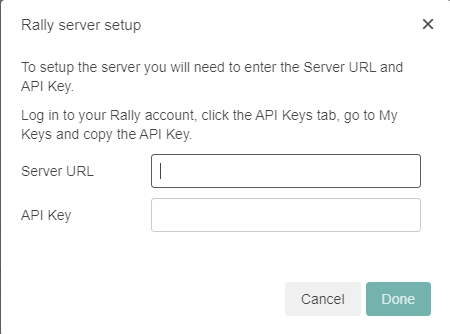 3. Click on the Rally server Set up server button and in the dialog that opens, enter your Rally server URL and API Key, then click the Done button.