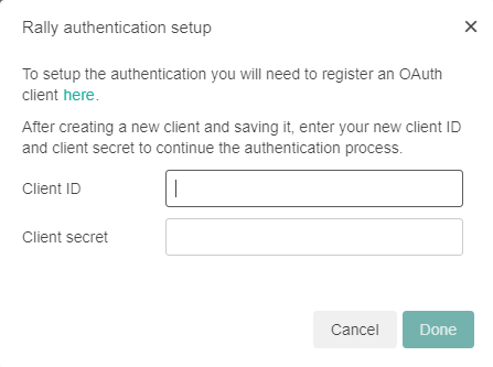 6. In the dialog that opens, enter the Rally Client ID and Client secret and then click Done.