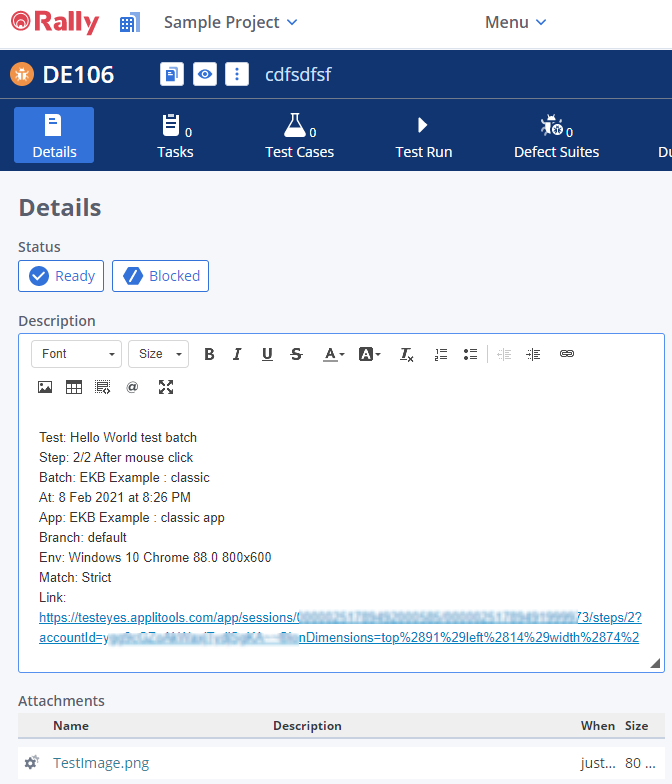 Typically Eyes users will continue to use Rally for their defect reporting workflow. The Eyes/Rally integration augments and extends this flow by providing easily accessed links between the Eyes step issue region and a Rally work item. When a Rally work item is created in Eyes, it is automatically populated with the Eyes information relating to the step:
