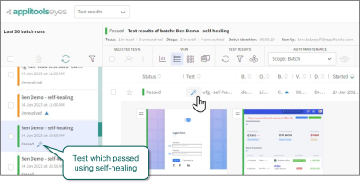 In the Test Manager, a test that passed with the help of the self healing algorithm is identified with a icon in the Batch list.