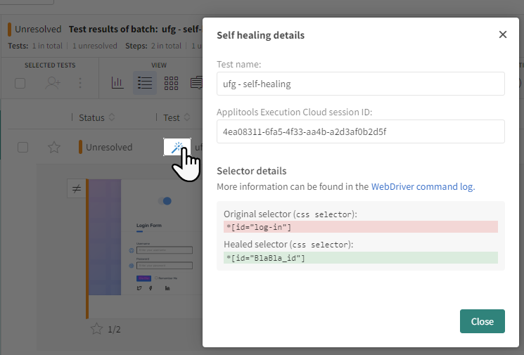This window includes details of the selector that failed and the selector which was used instead. In future test runs, Execution Cloud will use both the original selector and the new selector when trying to identify the screen element. Click the link to see details of the self-healing event, including when the event occurred.