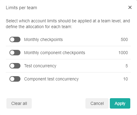 - A dialog opens that shows the four limits that can be divided amongst the teams. By default, the toggle to the left of each limit type will be disabled, meaning that the limit is applied at the account level.