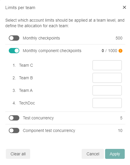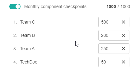 - At then end of this process, the sum of the values assigned to all the teams must equal the account limit. For example, in the screenshot below you can see how the maximum 1000 monthly component checkpoints have been fully distributed between the teams: