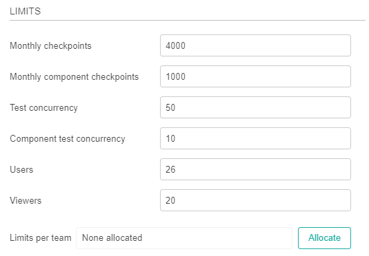 For example, if the account is limited to 900 checkpoints and there is a QA team and three development teams, the account admin may decide to provide each team with a "budget" – the main QA team is allowed to run 600 checkpoints and each development team is allowed to run up to 100 checkpoints. On the other hand, the account admin can decide to leave the concurrency limits at their default settings so that the limits are measured and applied at the account level and not per team, and this enables each team the possibility of running with the maximum concurrent test executions.