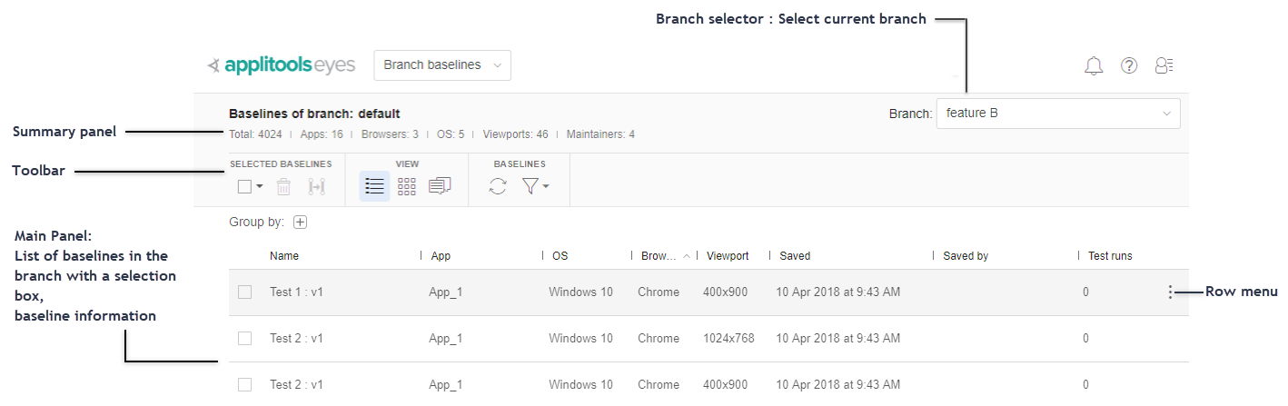 The Branch baselines page shows information about the baselines Defines the sequence of images to which the sequence of images captured at checkpoints will be compared. A test can have multiple baselines, each of which is characterized by the execution environment it ran on (operating system, browser and viewport size). A baseline can have instances in multiple branches. in a branch and provides tools to manage these baselines.