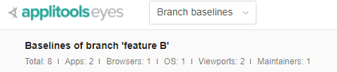 - In this panel, you can see the number of baselines and applications, the number of variations of the execution environments An execution environment is defined as a triplet of <OS, browser, viewport size>. When a test runs, its' execution environment, is defined by the platform on which the test runs or if run on the Ultrafast Grid, by the configuration of the Ultrafast Grid. A baseline is also associated with an execution environment. By default, the baseline chosen for a test is the baseline that has the same application name, test name, and execution environment as the test. , and the number of maintainers (people who saved a baseline) in the branch.