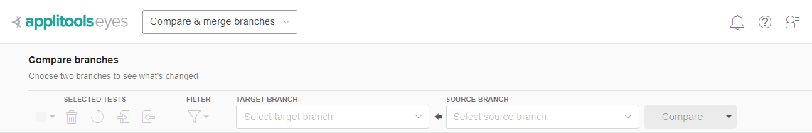 - To start a merge or compare operation, select Compare & merge branches from the Page navigator. If there is no current active merge session, then the screen will look like the screenshot below.