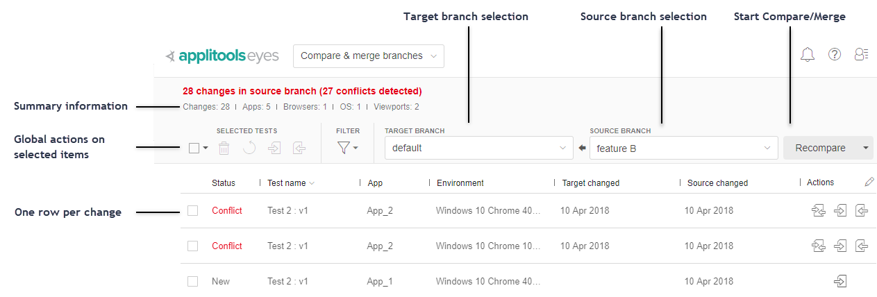 - Select the source and target branches and click the Compare button. Eyes will display the baselines that are only in the source or are different in the source and target. Eyes display next to each baseline a status with a value of New, Changed or Conflict.