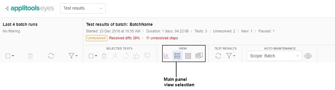You can use the main panel view selection toolbar to choose what information displays on the Test results page.