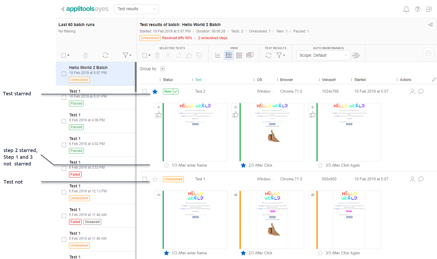 The Eyes Test Manager lets you bookmark tests and steps by marking them with a star on the Test results page. You can then filter for and revisit the bookmarked tests and steps in either the Test results page or the Last test run page. The image below shows both starred and unstarred tests and steps. A blue star indicates that an item is bookmarked. A white star indicates that an item is not bookmarked.