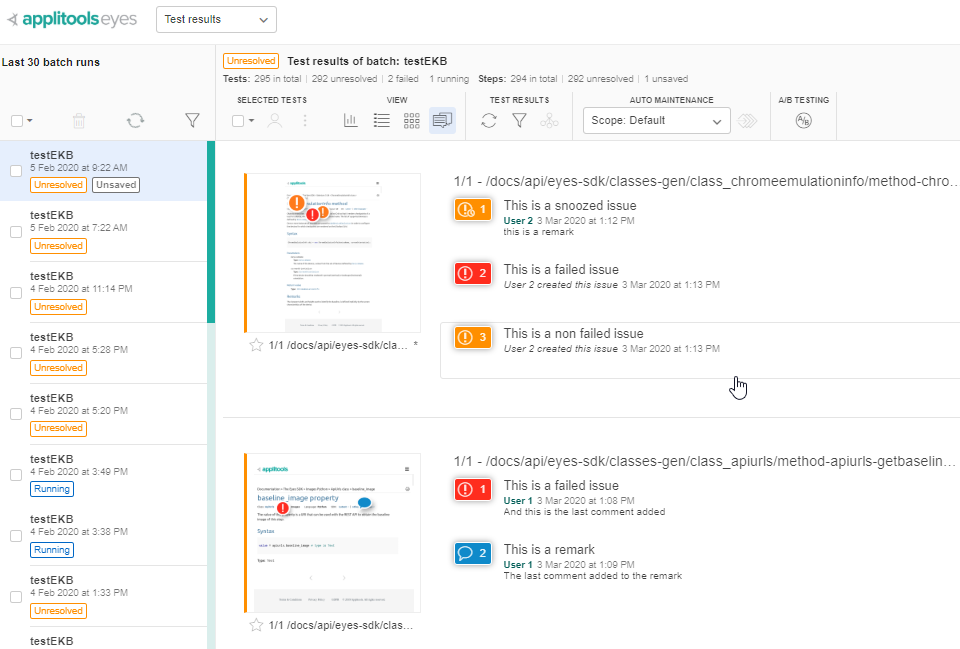 This article discusses the Issues and remarks view that you open by clicking on the button in the view toolbar. This view displays all the steps in the batch that have been annotated by a user with an issue or a remark. The main difference between an issue and a remark is that with an issue you can optionally control the pass status of the test while a remark does not impact the test or step status.
