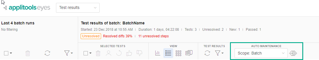 Eyes' Automated test maintenance provides you with a powerful set of features that significantly reduces your test maintenance overhead when you have many tests, and tests that run across multiple operating systems, browser types, device types, and screen sizes.