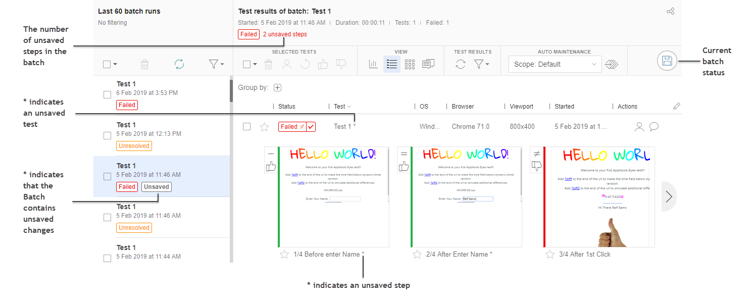 - For the current Batch, an indication of the number of unsaved steps in all the tests of the batch