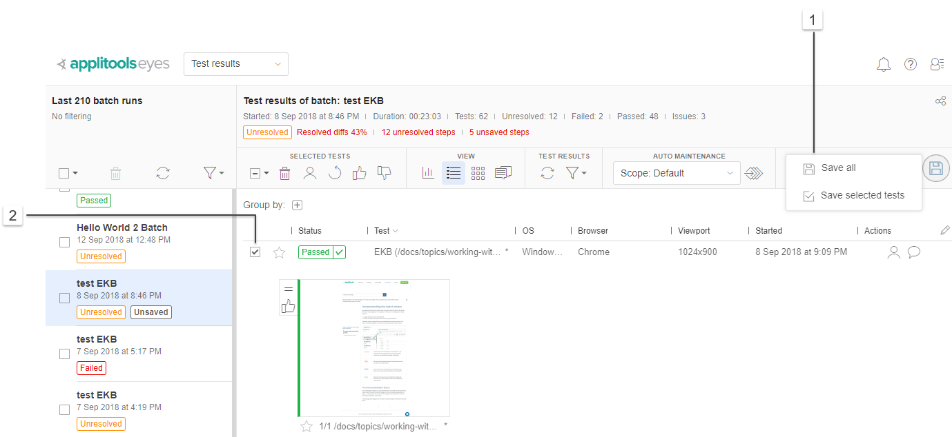 - Save selected tests. Choosing this option only saves tests whose checkboxes have been checked, even if they were not changed (see 2 in the image below).