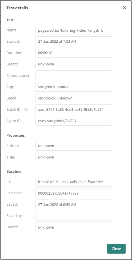 The Test details dialog box displays reference information on the Test and the Baseline to which the test belongs. Some of the information provided is general information and other details can be used for trouble shooting. Test properties that you define using the SDK configuration.addproperty are also show here, see Using user-defined batch properties.