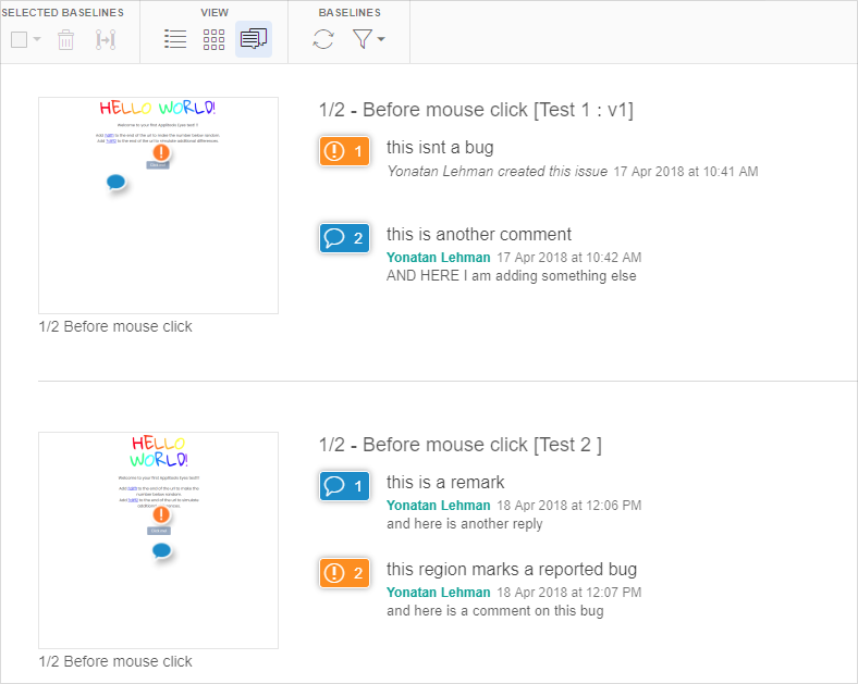 The branch baseline and test baseline pages provides tools in the toolbar that allow you to choose from three different views: